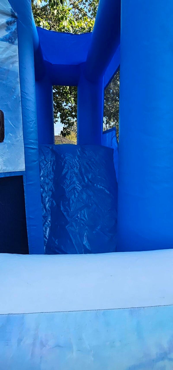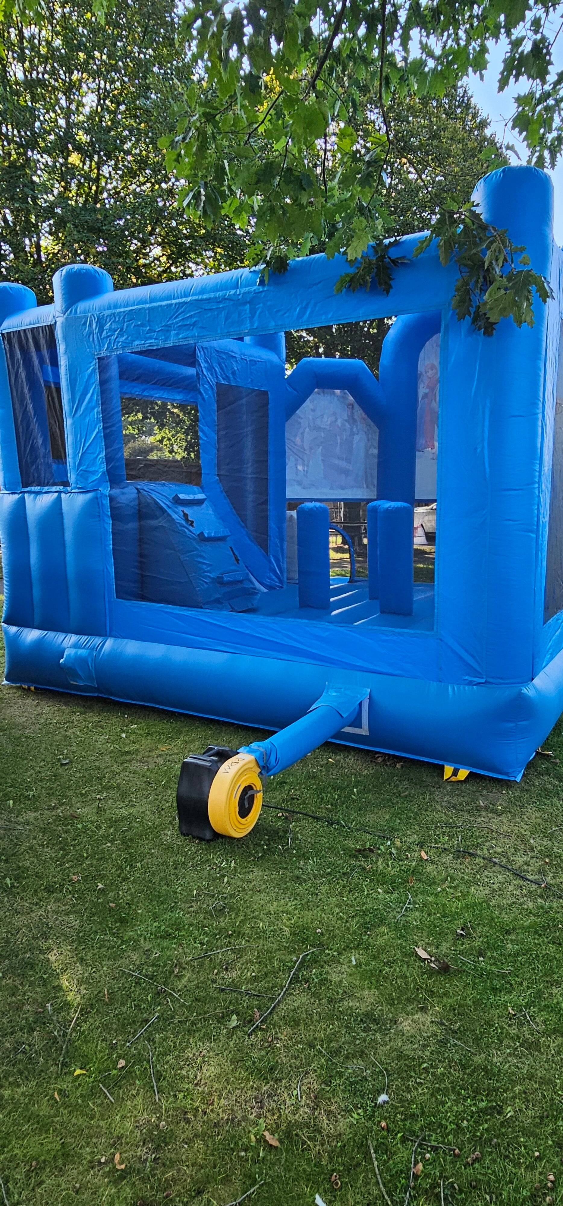Vermiete Hüpfburgen "Eiskönigin" mit Sprungfläche, Kletterwand und Rutsche. Schöne Burgen für den mittleren und großen Garten.